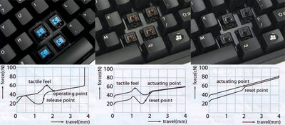 Die Switches können 4mm heruntergedrückt werden und haben nach 2mm den Anschlagspunkt, an dem der Tastendruck als Signal übernommen wird. Anschlagsweg und -punkt können aber verschieden gestaltet werden, was ein jeweils völlig anderes Tippgefühl zur Folge hat. Die Filco Majestouch Profi Tastatur gibt es bei uns mit drei unterschiedlichen Switch-Typen.