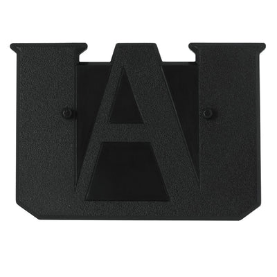 Die Figur steht auf einer stabilen, schwarzen Plattform, die das Logo der U.A. Oberschule zeigt, an der All Might unterrichtet.