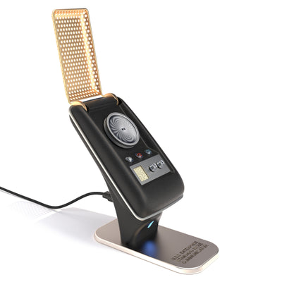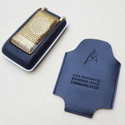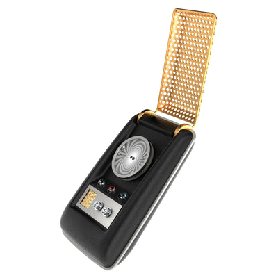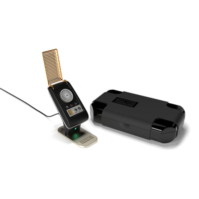 In Zusammenarbeit mit The Wand Company wurde jetzt auf Basis eines 3D-Scans des letzten erhaltenen Originalkommunikator der Star Trek TOS Kommunikator erschaffen. Dieses handliche Gerät kannst Du über Bluetooth mit Deinem Smartphone oder anderen Endgeräten verbinden, um ganz im Stil der Enterprise-Besatzung zu telefonieren. Neben dem Kommunikator, der die detailgetreueste Nachbildung auf dem Markt ist, erhältst Du ebenfalls eine Ladestation im Star Trek Design, über die Du den Kommunikator kabellos laden kannst. Damit Dein neues Lieblingsgerät in allen Situation bestens geschützt ist, liegen im Karton zudem eine Transportbox sowie eine Kunstlederhülle mit einer speziellen Prägung bei.