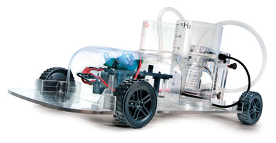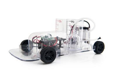 The fuel cell car features a combined PEM fuel cell, in which both electrolysis (i.e., the production of hydrogen and oxygen from water) and the conversion of hydrogen into electrical current take place. With this version, you can even watch the oxygen and hydrogen gases form in the two transparent water tanks.