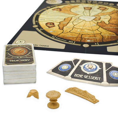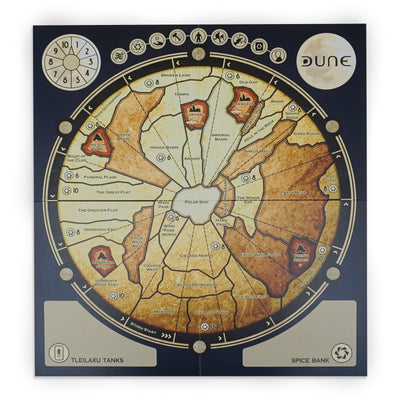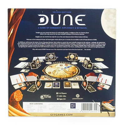 In this complex Dune board game you can use your knowledge of the famous series of novels by Frank Herbert and/or David Lynch's iconic film adaptation to take strategic action against your opponents. To do this, you need at least one and a maximum of five other players. Each of you represents a political faction or house and must try to assert their interests by placing their troops, using spice and the included battle wheels. You move around the board on a detailed map of the desert planet! All game cards and the instructions are in English.