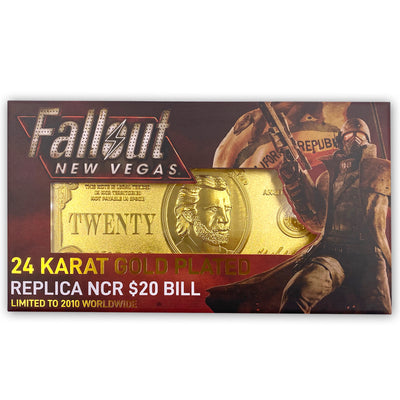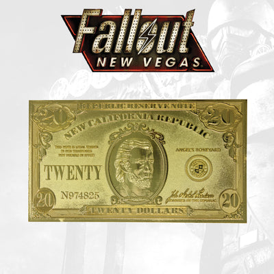 Welches bessere Item könnte es also geben, um Fallout: New Vegas gebührend (!) zu würdigen, als einen vergoldeten Fallout New Vegas Limited Edition NCR $ 20 Schein? Dieses exklusive Sammlerstück, von dem es nur 2010 Stück auf der ganzen Welt gibt, besteht aus geprägtem Metall und ist mit echtem, 24-karätigem Gold beschichtet. Der Schein bildet, ganz wie die Währung der New Californica Republic im Spiel, Ranger Seth ab und auf der Rückseite das Emblem der NCR. Der Schein wird mit einem Ständer zum Ausstellen geliefert.