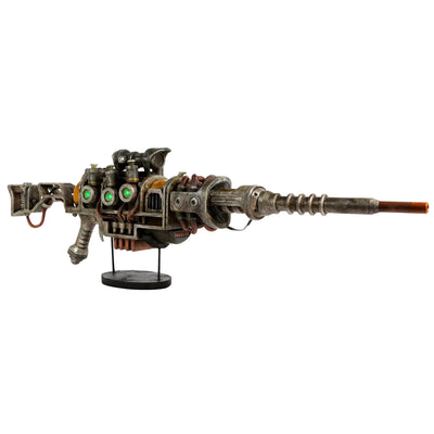 This extremely detailed plasma rifle replica is based on a plasma gun from Fallout 4. Here, the gun is shown with a sniper barrel, which gives the weapon a higher range and higher damage. Since humanity is (still) not stuck in a nuclear post-apocalypse these days, you get the plasma gun for decorative purposes only. Nevertheless, you can make the typical green LEDs light up when you pull the trigger. Note: The holder shown in the picture is not included – but the batteries for the LEDs are.