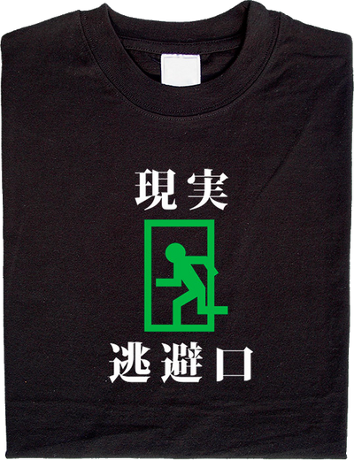 A shirt from our series for Japan fans: The Kanji (Japanese characters) on this shirt read "genjitsu tohi guchi", which (in order) means "reality", "escape" and "exit". Together, it means "escape from reality". So, the perfect shirt for the Japan geek :)