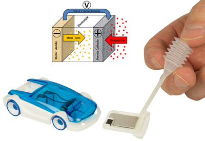 It is sufficient to apply a drop of salt water to the thin magnesium plate (of which the kit contains 4 pieces) and a reaction is set in motion in which the magnesium is oxidized with atmospheric oxygen and salt water. To enable this reaction, an additional activated carbon electrode acts as a catalyst. Electrical energy is released, which is then used to drive the car for about 15 minutes.