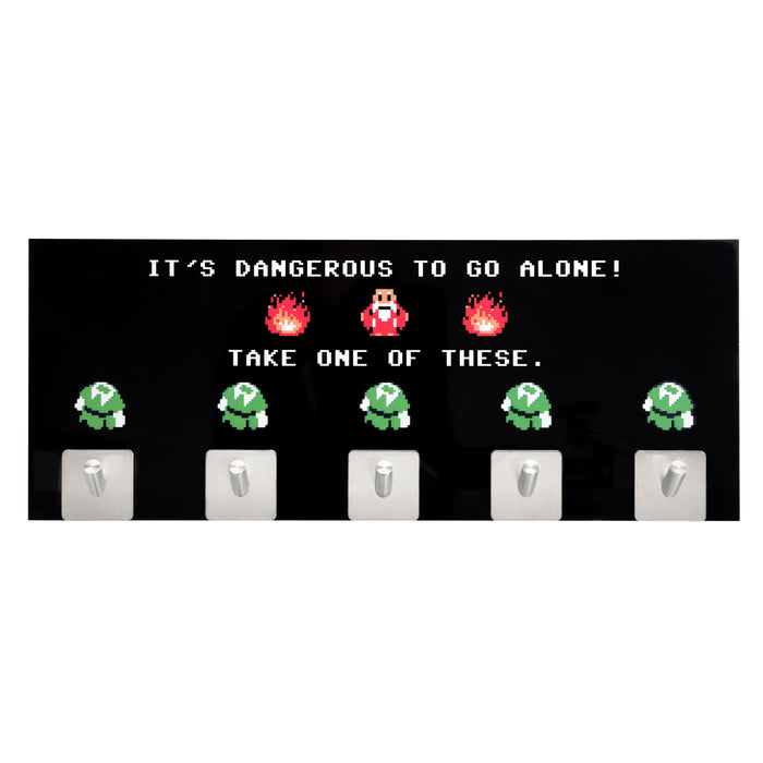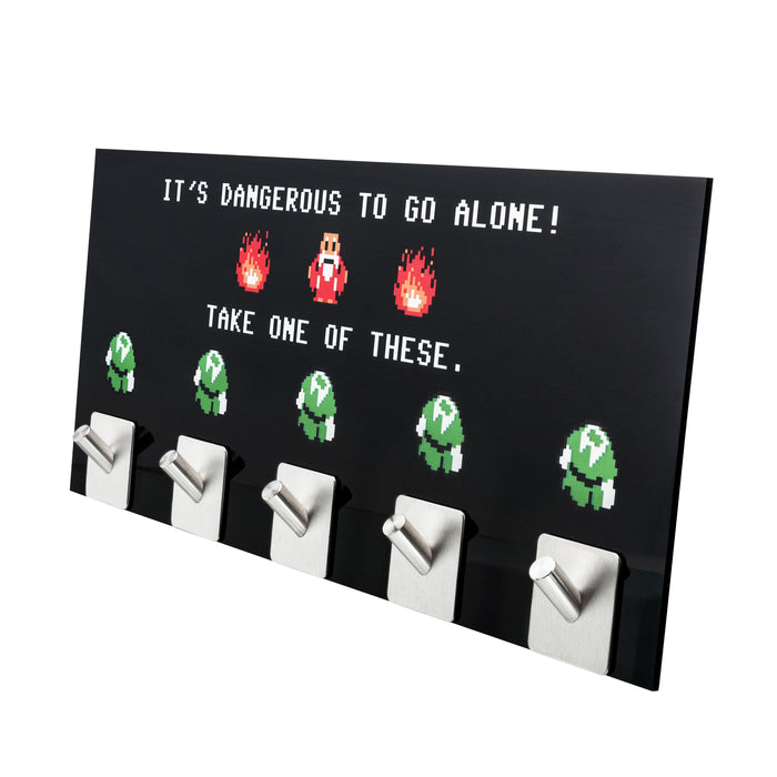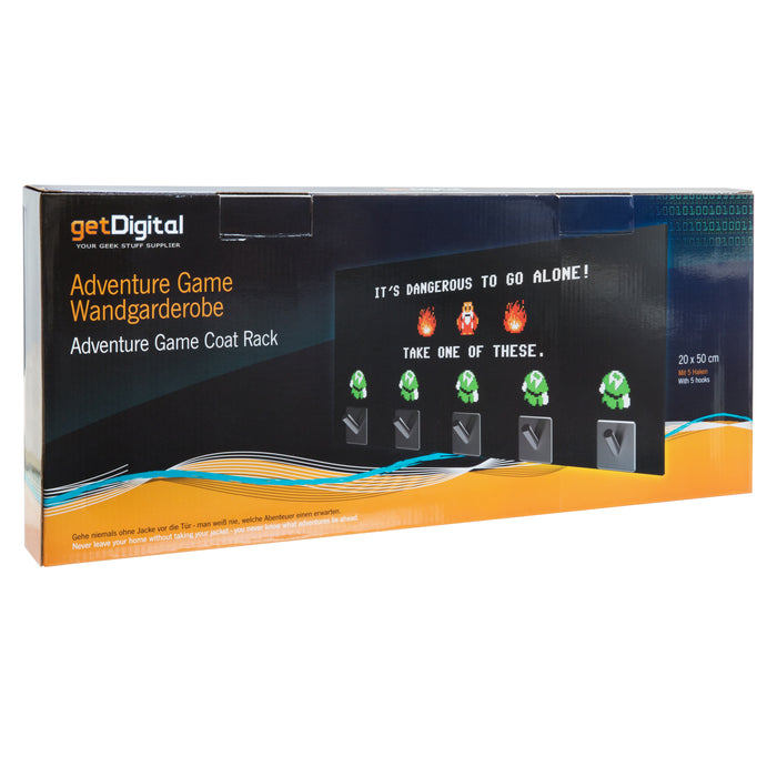 Luckily, the Adventure Game wall coat rack reminds you to be properly dressed before you leave the house (your mother would be proud of you!). The acrylic glass coat rack is adorned with a picture from a legendary video game in which a wise man warns you of the dangers of everyday life. The five metal hooks can hold enough armor sets for every working day and the coat rack can also be mounted bombproof on the wall with screws or nails (not included).