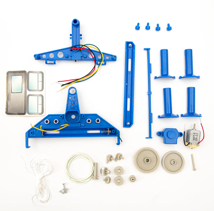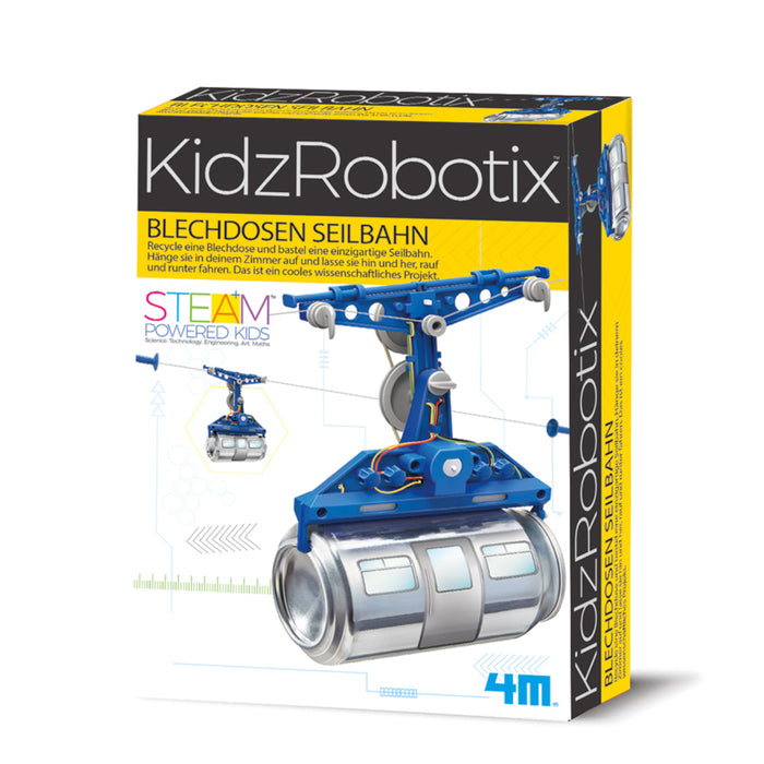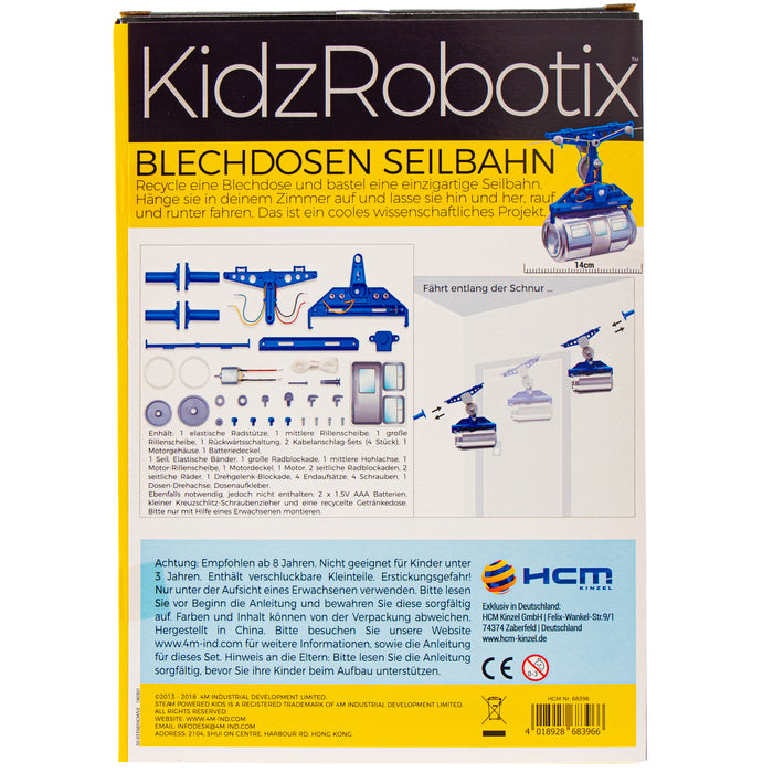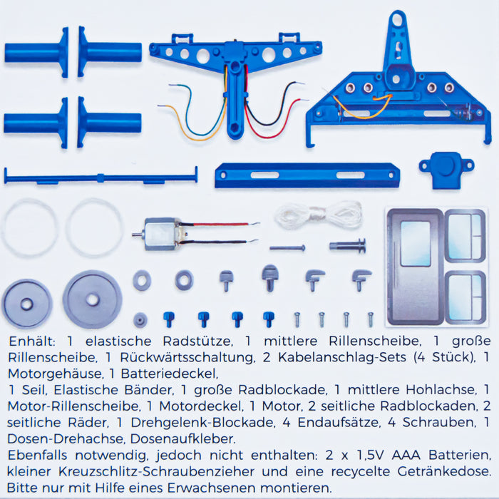 Für letzteren eignet sich der Blechdosen-Seilbahn Bausatz am besten. Dank der ausführlichen, beiliegenden Anleitung gelingt der Zusammenbau für Kinder ab 8 Jahren oder Erwachsene ganz leicht. Du benötigst lediglich noch eine leere (Getränke-)Dose, 2 x AAA Batterien und einen Schraubenzieher. Alle weiteren Bauteile, sowie Aufkleber für die Dose sind enthalten.