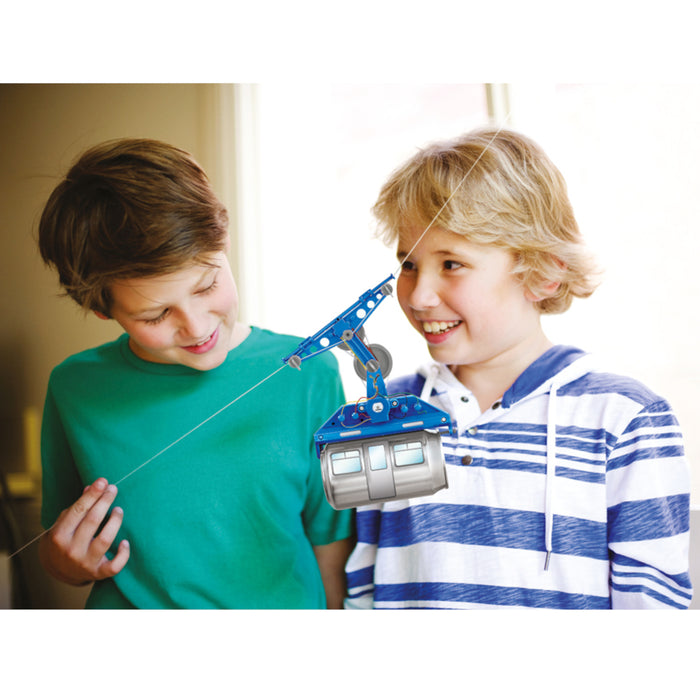 Nach dem Zusammenbau gleitet die Bahn an der zwischen Möbeln gespannten Schnur quer durchs Zimmer, egal ob auf gerader Strecke oder sogar bergauf. Dabei kann sie geheime Botschaften, Süßigkeiten oder andere kleine Gegenstände transportieren.