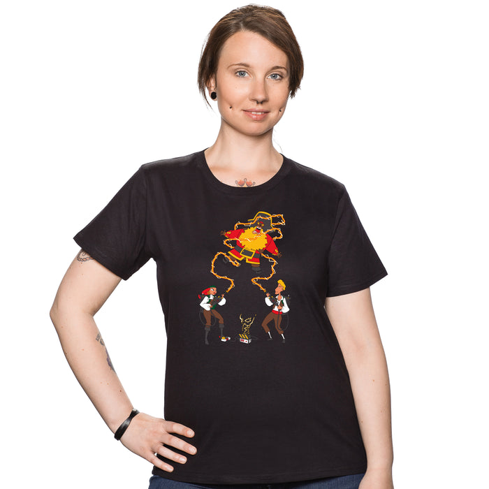 The ‘Ghost of Monkey Island’ T-shirt creatively combines elements of the two iconic franchises ‘Monkey Island’ and ‘Ghostbusters’. It shows a scene in which the characters Guybrush Threepwood and Elaine Marley from ‘Monkey Island’ fight against a ghost reminiscent of the infamous pirate antagonist ‘LeChuck’ from the same game.
