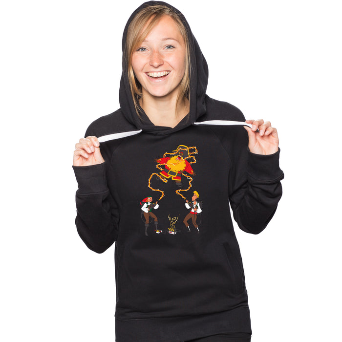 80% cotton from controlled organic cultivation and 20% recycled polyester with a thickness of 280 g/sqm. The hoodies have two separate pockets and fit true to size. Hoodies are only available in black and, depending on the design, in sizes S-5XL.
