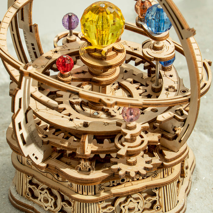 • Three-dimensional wooden model of a planetary system that moves to the melody of the built-in music box