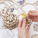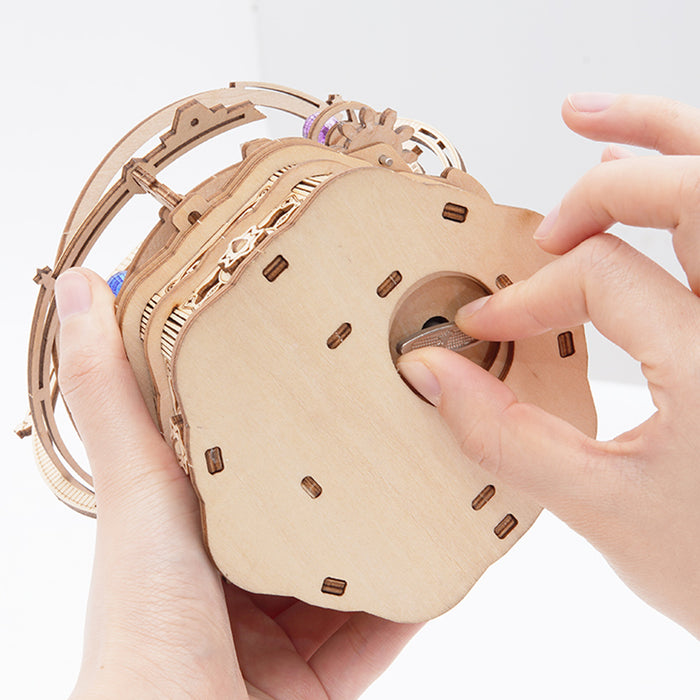 It is therefore an obvious choice to combine a music box and a so-called orrery - a mechanical model that shows the orbit of the planets. And the best thing about it is that you can put it together yourself! The Starry Night Mechanical Musical Clock Wooden Construction Set consists of 84 pre-cut wooden parts and various metal parts that can be assembled without any additional tools and completely without glue. All you need is the enclosed English instructions, a little dexterity and patience.