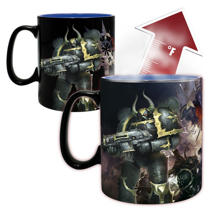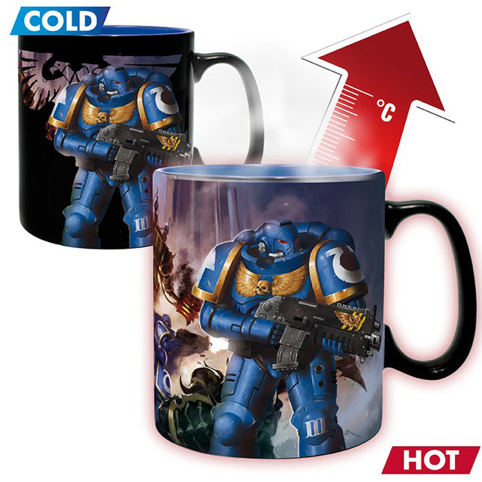 Der Thermoeffekt-Becher zeigt zwei Space Marines in ihrer übermenschlichen Pracht: Ein blauer Ultramarine, der für das Imperium kämpft, und ein Krieger der Black Legion, der dem Befehl von Abaddon dem Vernichter untersteht. Wenn du nun eine heiße Flüssigkeit wie Kaffee, Tee oder heiße Schokolade in den Becher gibst, wird im Hintergrund die erbitterte Schlacht zwischen den beiden Truppen sichtbar. Kühlt der Becher ab, sind wieder nur die beiden Space Marines zu sehen.