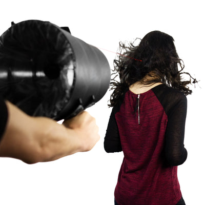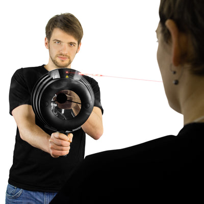 El nuevo modelo de Airzooka tiene uno para mejores objetivos construido -en láser. Como cualquier arma devastadora en buenas películas de acción. :) Con él puedes apuntar a tu próxima víctima, ¡pero nunca brillares en los ojos!