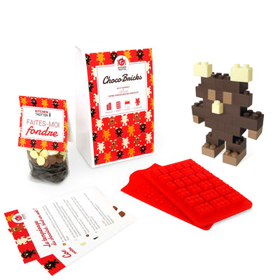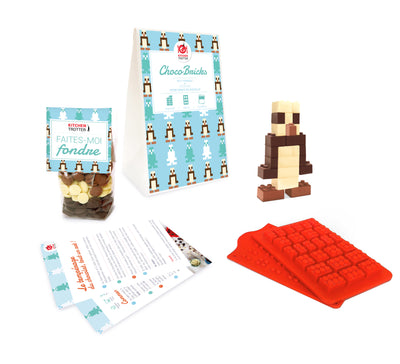En el kit también encontrará una forma de silicona con la que puede hacer los bloques de construcción disfrutados, también una guía multilingüe y galletas de chocolate finamente derretidas en blanco, marrón y negro. Ahora todo lo que tiene que hacer es derretir el chocolate en un baño de agua, llénelo en el molde y espere.