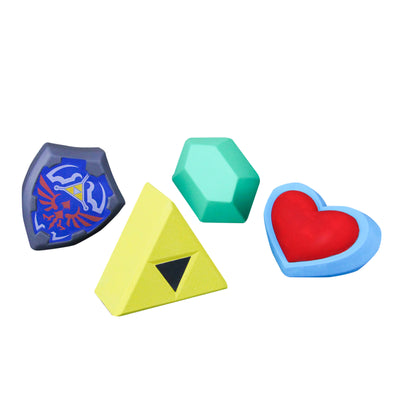 Dimensiones de la rupia: aproximadamente 5,5 x 8,5 x 4 cm; Dimensiones del escudo: aproximadamente 6,5 x 8 x 4 cm; Dimensiones del corazón: aproximadamente 8 x 6,5 x 4 cm; Dimensiones de la Trifuerza: aproximadamente 7,5 x 6,5 x 4 cm: