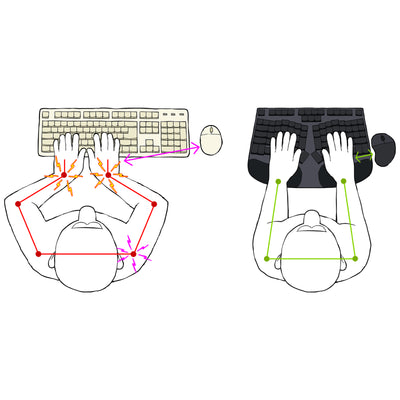 El teclado tiene, a diferencia de muchos otros teclados ergonómicos, 100% de las claves estándar, incluidas todas las teclas de función y solo usa el 60% del lugar de un teclado habitual. El diseño sigue el conocido estándar QWERTY, pero algunas de las claves especiales están especialmente dispuestas, por ejemplo, la tecla ENTER está al alcance del pulgar derecho. Sin embargo, la asignación de clave se puede ajustar fácilmente utilizando el software de los proveedores de tercera parte. La forma del teclado y la disposición de las teclas evitan que la muñeca se tuerza y una extracción más baja del mouse a las manos en su posición de descanso neutro en la cubierta de muñeca agradablemente acolchada.