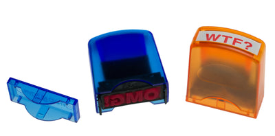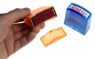 Los sellos TXT son autoentintables y, por lo tanto, no necesitan almohadilla de tinta. Ambos están llenos de tinta roja. Las carcasas de los sellos están hechas de plástico naranja o azul y tienen una tapa protectora que se debe quitar, en la que los sellos deben almacenarse en posición vertical para que la tinta fluya bien. Los sellos TXT están disponibles solo en un juego de dos, cada uno con un sello ¡OMG! y un sello ¿WTF?.
