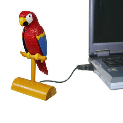 Antes de que el papagayo USB grabe algo, debe ser despertado por un ruido fuerte (por ejemplo, aplaudiendo). A partir de entonces, graba durante 5 segundos y luego reproduce la grabación en intervalos aleatorios. Durante la reproducción, el papagayo USB también mueve sus alas hacia arriba y hacia abajo y abre y cierra el pico. Además, el papagayo USB tiene frases preestablecidas en inglés (por ejemplo, "I am bored") que también reproduce en intervalos aleatorios.