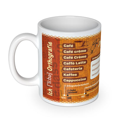 ¡Todo lo contrario! De nuevo Copa de ciencias "ortografía" ¡Ocupado, el alemán puede ser al menos tan nerd como Física, Matemáticas y CO! En esta taza de cerámica impresa en ruta, puede esperar una información fascinante sobre el idioma que la mayoría de nosotros usamos todos los días: la taza le muestra errores frecuentes (y sobre todo por qué estos errores ocurren con tanta frecuencia), le recuerda que el alemán puede ser todo. encadenado junto con un guión y también ilustra la historia de las reformas ortográficas queridas y odiadas.