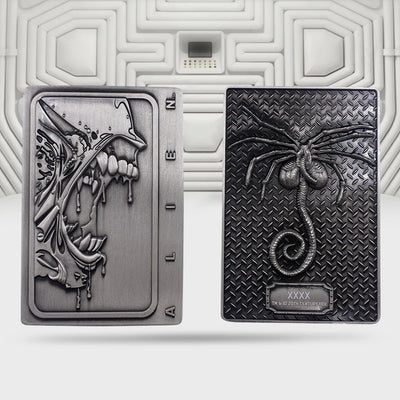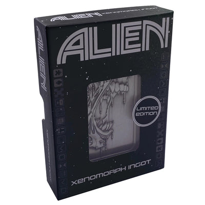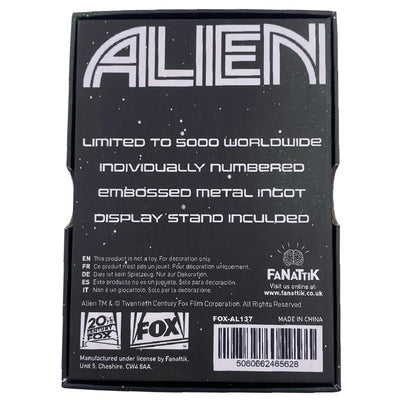 In den Metallbarren ist ein detailliertes Motiv des Xenomorph aus Alien eingraviert, der Name des Films ist am rechten Rand abgebildet. Auf der Rückseite findest du eine Gravur des Facehuggers, zusammen mit der individuellen Nummer deines Sammler-Items, von dem es weltweit nur 5.000 Stück gibt! Der Metallbarren wird zusammen mit einem praktischen Display-Ständer geliefert.