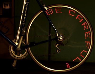 Le Bike Messenger est un petit appareil équipé de LED que l'on peut fixer entre les rayons d'un vélo. Dès que l'on roule à plus de 6 km/h, l'une des 6 messages prédéfinis, la vitesse actuelle ou même un message personnalisé jusqu'à 13 caractères s'affiche. L'affichage se fait par des LED clignotantes qui changent selon la position de l'appareil. Grâce à la persistance rétinienne, l'illusion d'un texte continu est créée.