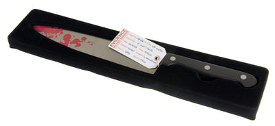 Le couteau de cuisine Sanglant est d'ailleurs livré comme une pièce à conviction de la police avec une étiquette en carton attachée.