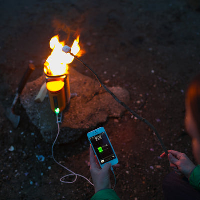 Pour faire fonctionner le réchaud, il te suffit de placer quelques brindilles ou autre biomasse sèche dans la chambre de combustion et de l'allumer avec l'allume-feu fourni. Pendant que ton ragoût ou un autre plat mijote, une partie de la chaleur est absorbée par une sonde en cuivre et transmise à un générateur thermoélectrique. L'électricité produite alimente un petit ventilateur qui maintient le feu en marche. De plus, le port USB intégré est alimenté par 2 watts à 5 volts, ce qui te permet de recharger ton smartphone ou un autre appareil USB. Selon ce que tu brûles, une puissance de sortie de 4 watts est même possible par moments !