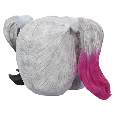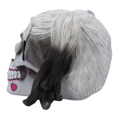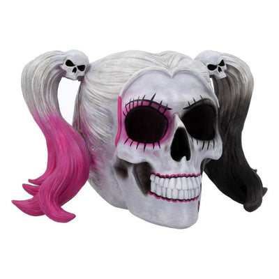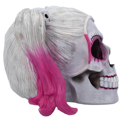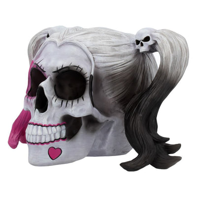 Cette décoration morbide de la pièce Crâne de Lil Monster de papa serait tout à fait à son goût : juste le bon mélange de sombre et de girly. Le crâne décoratif est inspiré de la structure d'un crâne humain, y compris les cheveux. Divers détails noirs, roses et aussi blancs rappellent la diablesse explosive aux côtés du clown meurtrier. Pour tous ceux qui ont toujours secrètement la fièvre pour les méchants, ce crâne perfectionne l'étagère de collection anti-héros.