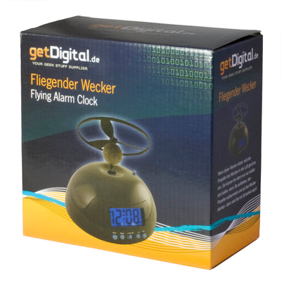 Le Réveil Volant a une hélice qui s'envole dans les airs lorsque l'alarme retentit. L'alarme ne peut être désactivée que lorsque vous récupérez l'hélice et la remettez sur l'horloge. Se lever est donc garanti :)