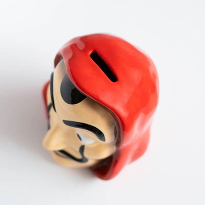• Tirelire en céramique 3D dans le style de «Maison de Papier» ; Te permet d'économiser de l'argent dans une tête avec masque de la série Netflix ; Se ferme avec un bouchon au fond ; Produit sous licence officielle