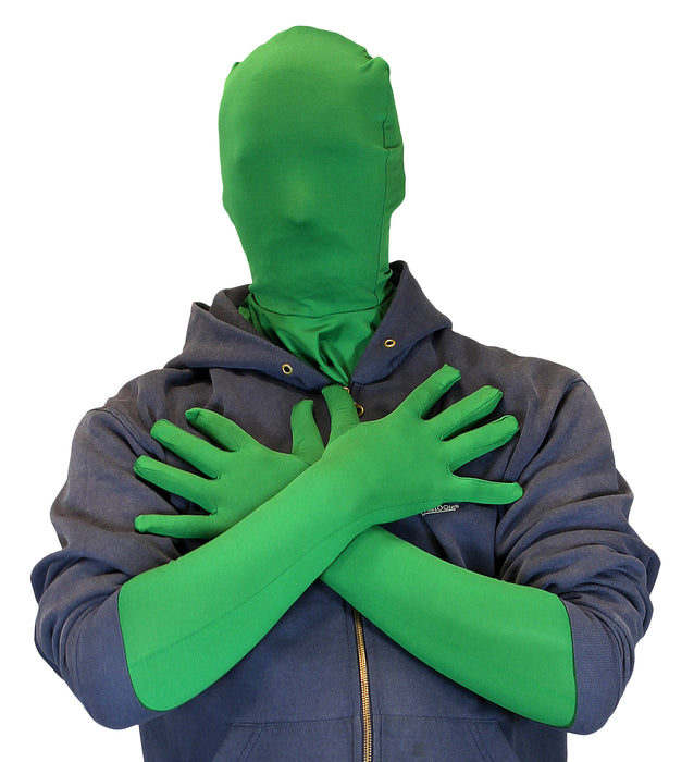 L'élégant trois-pièces vert que nous avons ici pour toi a un énorme avantage : c'est... un trois-pièces et non une combinaison (l'avons-nous déjà mentionné ?). Cela signifie que tu peux porter tes vêtements habituels et couvrir le reste - c'est-à-dire généralement les mains et la tête - avec le tissu vert. Les gants mesurent environ 51 cm de long et arrivent à peu près jusqu'au coude. Le couvre-chef ne s'arrête pas non plus au menton, mais tombe presque sur les épaules, de sorte qu'il couvre également une encolure normale.