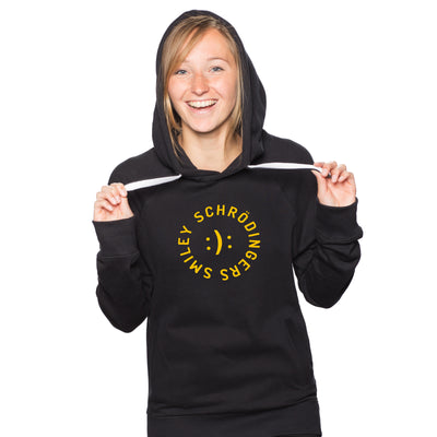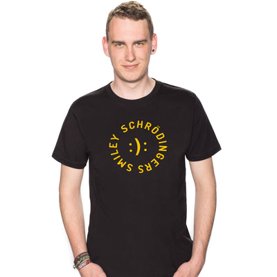La maglietta mostra uno smiley che è sia triste che felice per simboleggiare questo stato di simultaneità. Il testo "Smiley Schrödinger" ruota intorno allo smiley, sottolineando ulteriormente l'ambiguità della condizione. Questo disegno illustra in modo umoristico il concetto di sovrapposizione, ovvero che un sistema può esistere in più stati simultaneamente fino a quando non viene osservato, il che si riflette nelle due espressioni emotive dello smiley.