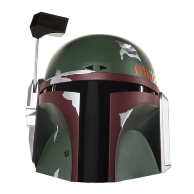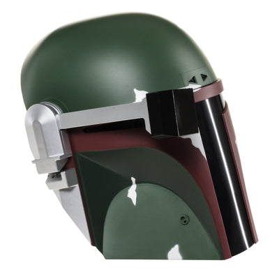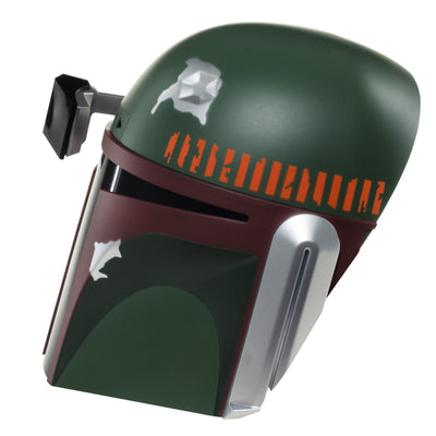 L'elmo di Boba Fett presenta i soliti danni, tra cui una bella ammaccatura sulla fronte. La sua visiera si illumina di rosso, ma la fonte di luce più luminosa è il telemetro, che puoi regolare tu stesso. Il modo migliore per capire la distanza è guardare le foto in alto a sinistra. Il casco è dotato di LED che lo illuminano; sono necessarie solo tre batterie AA aggiuntive. Un aspetto particolarmente positivo è che non ci sono cavi fastidiosi.