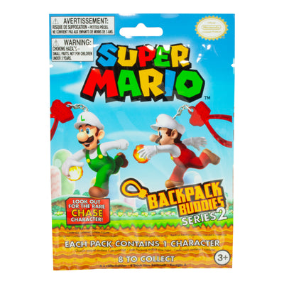 Queste etichette per zaino sono ispirate ai personaggi e agli oggetti dei giochi di "Super Mario" e possono essere attaccate a zaini, giacche e altri oggetti con la clip inclusa. Ogni confezione contiene una delle seguenti otto etichetteMario di fuoco, Luigi di fuoco, Goomba, Boo, Fungo, Guscio di tartaruga, Punto interrogativo o Pallottola.