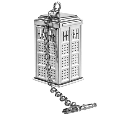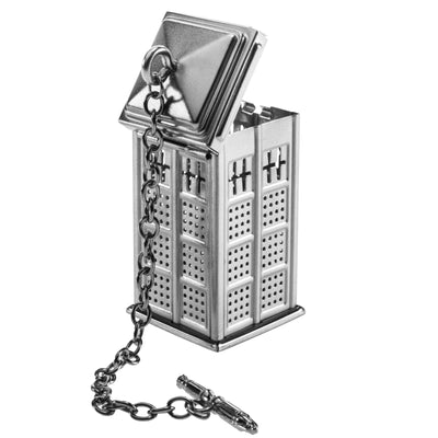 Voor de perfecte dosering zorgt deze kleine metalen TARDIS. Het dak kan worden geopend en het thee-ei is zo eenvoudig te vullen. Hang het vervolgens in een geschikt vat - een glazen kan ziet er natuurlijk het beste uit - en laat het 3-5 minuten trekken. Het draait allemaal om de juiste maat van ruimte en tijd. ;) De greep aan het einde van de ketting heeft trouwens de vorm van een kleine sonische schroevendraaier.
