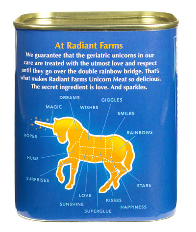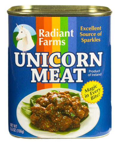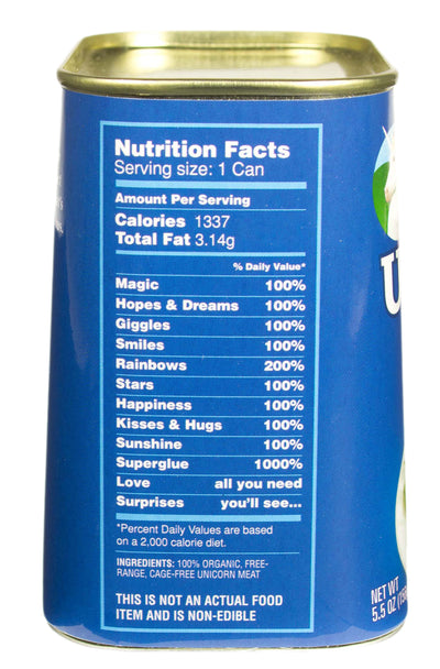 Einhorn Dosenfleisch ist überaus nahrhaft und reich an überlebenswichtigen Grundsubstanzen. Schon eine Portion deckt Deinen gesamten Tagesbedarf an Magie, Hoffnung und Träumen, Lächeln, Regenbogen und Sternen, Küssen und Umarmungen, Liebe und Sonnenschein - ein gesünderes und zufriedenstellenderes Lebensmittel wirst Du kaum woanders finden. Da für das Einhorn Dosenfleisch kein einziges Tier getötet werden musste, ist es sogar für Vegetarier geeignet.