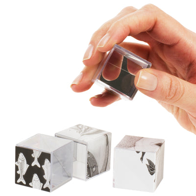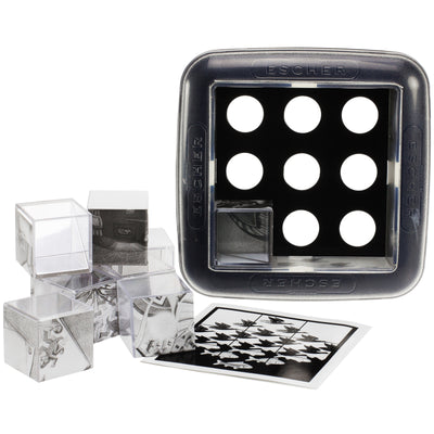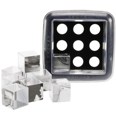 Door de juiste ordening van de blokken en dus de daarin opgenomen spiegels, kun je in totaal vijf belangrijke werken van M.C. Escher nabootsen. De afbeeldingen zijn werken van de kunstenaar die te maken hebben met optische illusies, vervormingen en spiegelingen - die elke geek en nerd zullen verrukken!