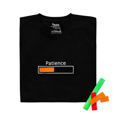 Auf der Vorderseite des T-Shirts findest Du einen weiß umrandeten Klettstreifen mit der Überschrift "Patience". Auf diesem Streifen kannst Du einen der enthaltenen Streifen in Rot, Orange oder Grün anbringen, um Deinem Umfeld zu zeigen, wie geduldig Du gerade noch bist. Die bunten Streifen kannst Du problemlos mit einer Schere kürzen, um individuelle Fortschrittsbalken für die Anzeige zu erstellen. Von jetzt an sollte jeder wissen, wann mit Dir zu spaßen ist und wann nicht. ;)