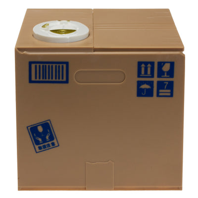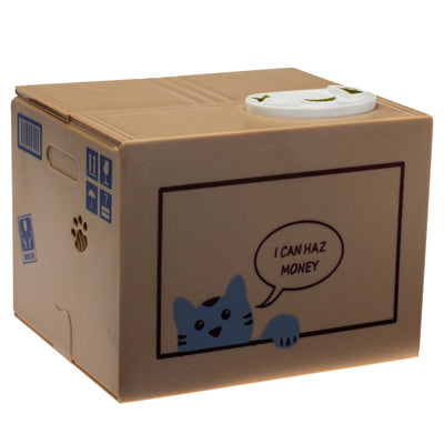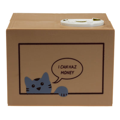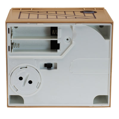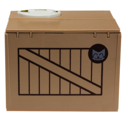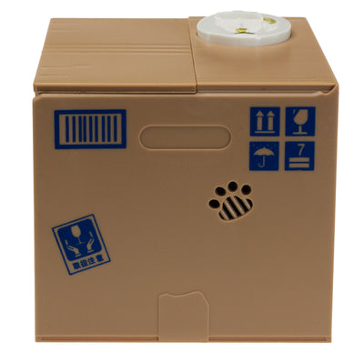 De kat geeft je geld natuurlijk niet meer terug. Daarvoor moet je de doos omdraaien en het deksel aan de onderkant openen. Hier zit ook de aan- en uitschakelaar, voor het geval je de kat in de doos een langere pauze wilt gunnen of als ze geen geld van vreemden moet aannemen. (Wij zouden je echter aanraden om zoveel mogelijk mensen aan te moedigen deze ongebruikelijke spaarpot eens uit te proberen...)