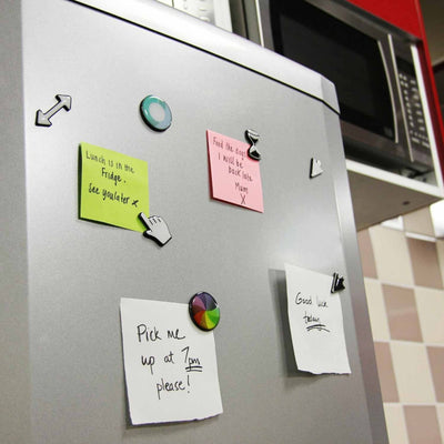Als je een computernerd iets voor je wilt laten doen, moet je eerst zijn aandacht trekken. Normaal gesproken is deze namelijk grotendeels op het scherm gericht. Het beste kun je dit doen met symbolen die hij kent. Als je bijvoorbeeld wilt dat hij bij de volgende boodschappen snacks voor je meeneemt, of aan jullie belangrijke gezamenlijke afspraak denkt, wijs hem er dan op met de koelkastmagneet muisaanwijzers. Want zelfs als hij zijn ogen nauwelijks van het scherm afhaalt, moet ook de gewone geek af en toe iets eten en drinken. Aan de koelkastdeur zullen de bekende symbolen hem meteen opvallen, net als de notities die eraan hangen. Natuurlijk kun je de nerdy magneten ook op alle andere metalen oppervlakken aanbrengen.