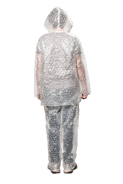 Het pak bestaat uit twee delen, een broek met elastiek en een bovenstuk met capuchon, die ruim bemeten zijn. Omdat het pak doorzichtig is, moet je (tenminste in het openbaar) nog iets eronder dragen - behalve natuurlijk als je je geliefde wilt verleiden. We zijn er zeker van dat je met dit pak in ieder geval alle blikken en mogelijk ook handen naar je toe trekt.