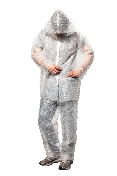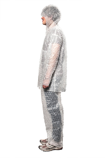 "Hé man, waar is mijn bubbelplastic-pak?"