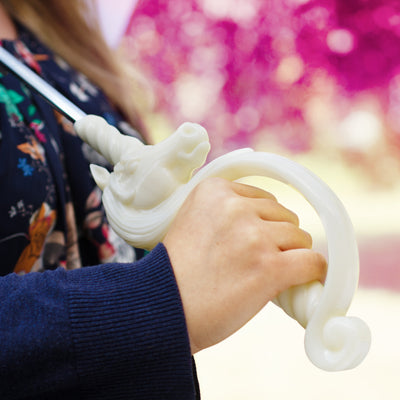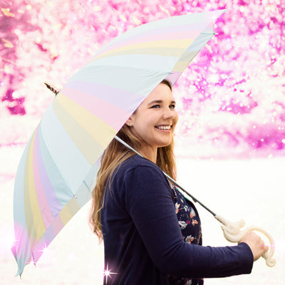 Aber kommen wir zurück zu dem tragbaren Einhorn. Ein lebensgroßes Fabelwesen wäre alles andere als tragbar und würde zudem eine Menge Heu (oder was auch immer Einhörner fressen) verdrücken. Die deutlich praktischere Alternative stellt unser magischer (!) Einhorn-Regenschirm dar. Neben der offensichtlichen Funktion, mehrere Personen vor Regen zu schützen, wird dieser unverwechselbare Schirm ein Lächeln auf das Gesicht aller Menschen zaubern, an denen Du vorbeigehst. Denn auch bei gutem Wetter zieht das must-have der dunkleren Jahreszeiten die Blicke auf sich: Beginnend bei dem Griff, der einem Säbelgriff gleicht und den ein Einhornkopf aus echtem (!) Ainkhürn ziert, über den Schirm an sich, der in Regenbogenfarben gehalten ist, bis zur Spitze, die in einem goldenen Miniaturhorn endet. Noch Fragen, warum der Regenschirm als magisch zu bezeichnen ist? Dachten wir auch nicht.