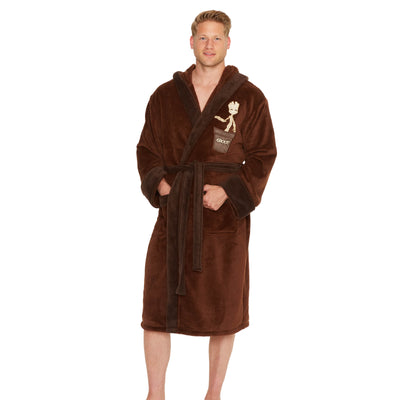 Maar terug naar dingen die echt belangrijk zijn: Deze badjas is, in tegenstelling tot zijn schorsige naamgenoot, niet gemaakt van boomschors, maar van heerlijk zachte stof en heeft een capuchon en een riem. Patches op de borst, rug en arm tonen de schattige Baby Groot, zijn naam als opschrift en het logo van de Guardians of the Galaxy. Zo gekleed ben je goed uitgerust voor de lange weg naar de badkamer of een ontspannen avond voor de tv. En mocht je ondertussen Thanos een klap willen geven, dan zal de badjas je ook goed van dienst zijn! ;)