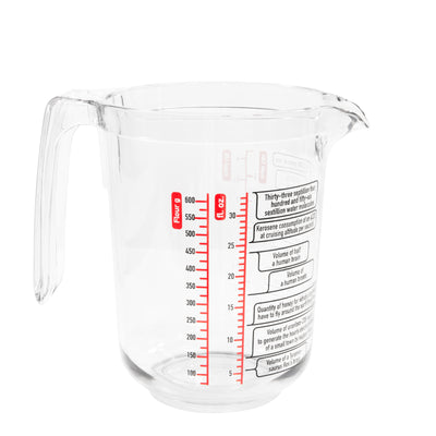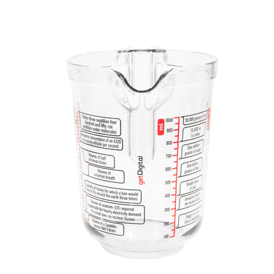 Since most measuring jugs are bland and boring, we've developed the definitely-not-boring Science Measuring Jug! This sturdy plastic jug can not only be used to measure sugar, flour and liquids in ml, cups (US and UK) and liquid ounces, but will even teach you 14 interesting fun facts! Would you have known how much kerosene an Airbus A320 at cruising altitude uses per second? Or how much space 30.000 rice grains need?