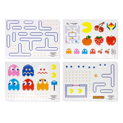 Auf vier Bögen findest Du insgesamt 143 wasserfeste und ablösbare Aufkleber im Retro-Pixellook, mit denen Du Laptops, Smartphones und Tablets verschönern kannst. Neben Pac-Man und den Gespenstern Blinky, Pinky, Inky und Clyde in verschiedenen Ausführungen sind außerdem diverse Levelumgebungen, Items und Punkte enthalten. Damit hält Dich nichts mehr davon ab, Deine elektronischen Geräte mit selbstgebauten Levels und dramatischen Verfolgungsszenen zu dekorieren.