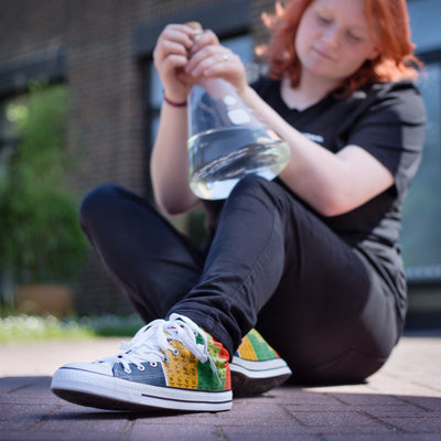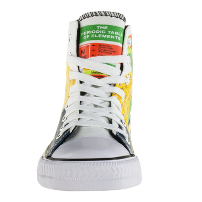 Die Schuhe sind im klassischen Sneaker-Design gehalten: Sohle mit breitem hellen Rand, Gummikappe, Textil knöchelhoch, acht Ösen für die Schnürsenkel. Damit kannst Du sie stilsicher mit wirklich allem kombinieren und sie kleiden weibliche Füße genauso gut wie männliche. Rund um Ferse, Fuß und Knöchel ist seitlich das Periodensystem in Englisch aufgedruckt. Falls Du mal eine kurze Gedächtnislücke hast, kannst Du also auch unauffällig nochmal auf Deine Schuhe schielen und findest Dich wieder zurecht. ;) Ob Chemielehrer die Schuhe während Klausuren tolerieren, haben wir allerdings noch nicht ausprobiert... Ein Versuch ist es wert. :)