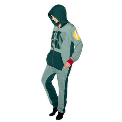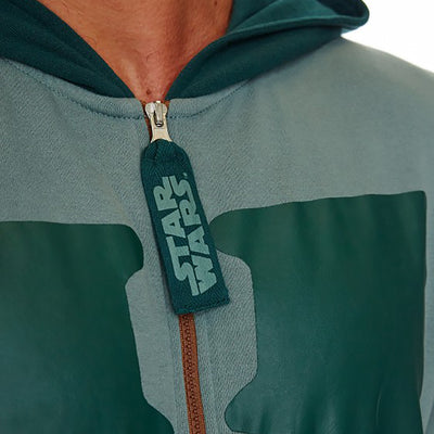 So wie Boba Fetts Rüstung setzt sich der Jumpsuit aus verschiedenen Teilen in den typischen Farben zusammen. Darin eingepasst ist auch die geteilte Kängurutasche am Bauch. Auf den Armen sitzt das Mythosaurier-Emblem, auf der Brust das Mandalorianer-Abzeichen. Auch auf eine Kopfbedeckung muss Boba Fett nicht verzichten, die Kapuze ist allerdings ein bisschen weniger widerstandsfähig als der originale Helm. Dafür aber weniger kalt und unbequem. ;) Geschlossen wird der Einteiler mit einem stabilen Reißverschluss an der Vorderseite und sofort hat man eine ganze Ausrüstung angelegt.