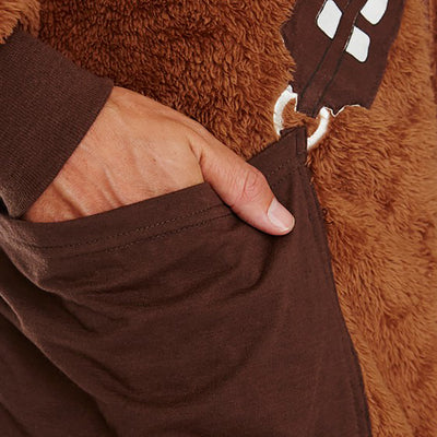 Deutlich authentischer und außerdem unglaublich bequem kommt der Star Wars Jumpsuit Chewbacca daher. Dieser kuschelig weiche Kapuzenoverall verwandelt Dich in Windeseile in den heimlichen Liebling vieler Star-Wars-Fans. Neben dem Fell, für das keine Wookies in Mitleidenschaft gezogen wurden, begeistert der Jumpsuit außerdem durch seine am Energiezellengurt aufgehängte Seitentasche, in der Du Snacks, die Fernbedienung oder andere nützliche Dinge verstauen kannst. Damit Du problemlos in den Overall steigen kannst, befindet sich auf der Vorderseite ein Reißverschluss mit extra großer Star-Wars-Zughilfe, die Du selbst mit blaugefrorenen Fingern auf Hoth zuziehen könntest. ;)